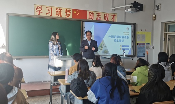 之后英语、日语、俄语三个专业,分别进行了各学科方向的详细讲解与深入交流。英语系主任刘宇对英语语言文学、外国语言学及应用语言学两个方向的学科优势、优秀毕业生展示、考研指导等方面进行了详细地讲解。日语系主任曾妍主要从师资力量、课程设置、本学科方向的优势、学生就业和关于考研五个方面对日语语言文学专业进行了细致介绍。院长彭又新从学科简介、研究方向、专业发展前景、专业招生优势等方面解说了俄语语言文学专业的情况,并亲切地和同学们进行了深入交流,宣讲会受到与会师生的一致好评。