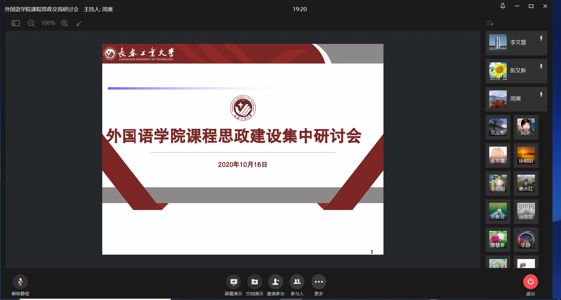 研讨会中,各专业推选的8个课程思政案例参加学院展示,分别是孙莉老师的《全新版大学英语综合教程课程思政案例设计》、张羽华老师的《全新版大学英语综合教程3课程思政教学案例》、李秀文老师的《新视野大学英语课程思政案例设计》、姜水红老师的《托福课程思政案例设计》、赵艳宇老师的《英语国家社会与文化-课程思政教学案例》、李笑老师的《英语阅读3-课程思政教学案例》、宋卓时老师的《日本概况-课程思政设计》、龙慧星老师的《基础日语1-课程思政教学案例》等8个优秀案例。