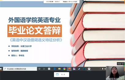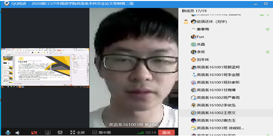 本网讯(通讯员 刘宇)按照《长春工业大学2020届本科毕业设计(论文)答辩工作方案》以及bat365官网登录入口关于2020届本科毕业论文答辩指导文件的要求,在经过三轮中国知网论文查重检测后,英语系2020届本科毕业论文进行了首次答辩。鉴于疫情影响,结合学校要求,首次答辩以“指导教师+评阅教师”两项评分作为总成绩。在此基础上,评出排名前20%和后5%的同学参加二次网络视频答辩,其余同学自愿申请参加答辩。