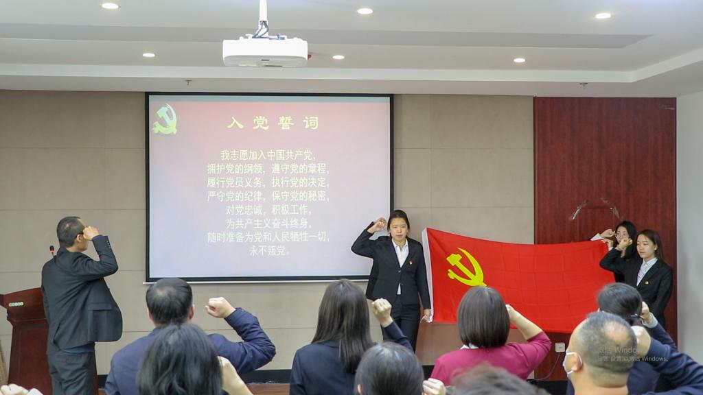 新发展教师党员范立彬同志面对鲜红的党旗庄严宣誓并领誓,全体党员紧握右拳,神情庄重、誓言铮铮,集体重温了入党誓词,进行了一次思想上、心灵上的洗礼,进一步坚定了初心和使命。范立彬同志在发言中,介绍了自己在党组织的教育引领和党员同志的帮助下,不断实现思想进步、转变和升华的心路历程,表达了不断端正入党动机、踏实服务奉献、矢志教书育人,为共产主义奋斗终身的坚定信念和决心。