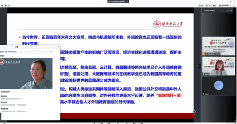 新闻网讯(通讯员 汪沛)7月6日,为了探讨外国语言文学类专业建设和人才培养改革实践,服务我省一主六双和六新产业建设等重点领域需求,bat365官网登录入口组织教师线上参加了吉林省新文科(外国语言文学类)“长白山大讲堂”。