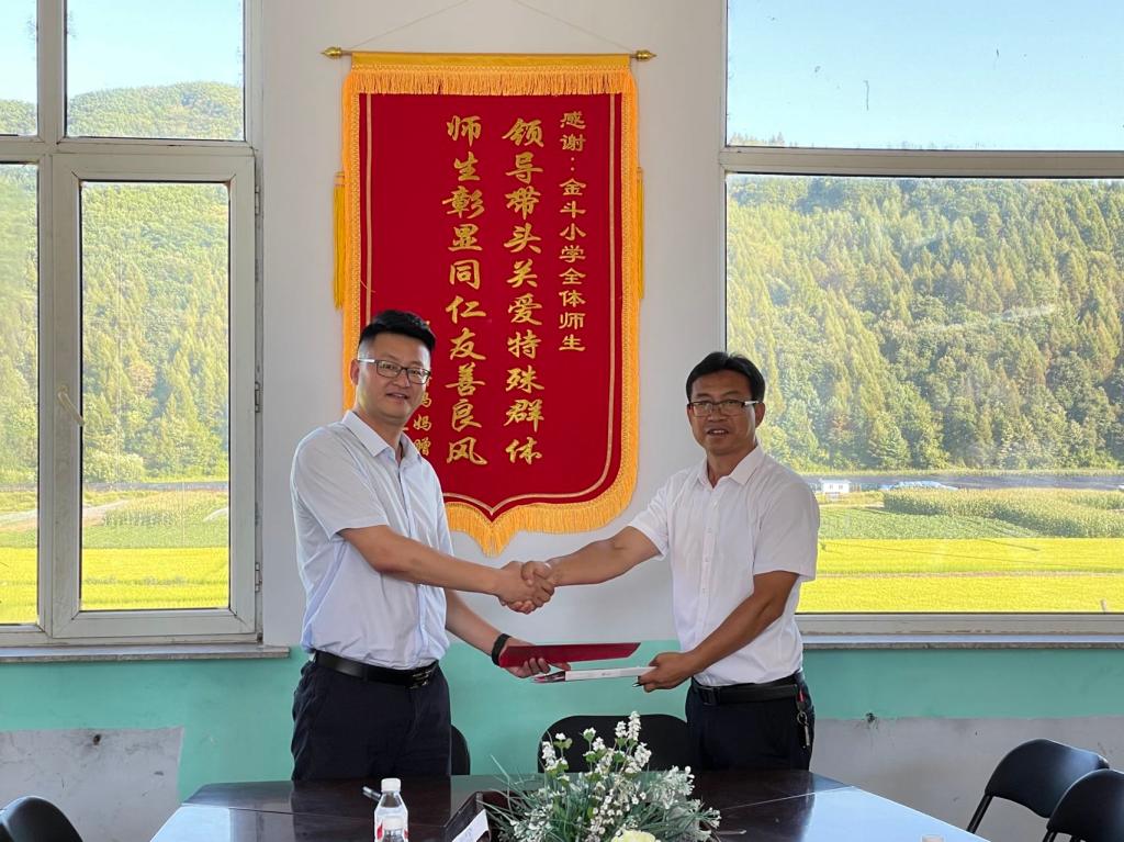 随后,走访团队来到金斗朝鲜族满族乡中心小学,校长李龙介绍了学校的基本情况,王轶和隗英辉校友共同为bat365官网登录入口大学生就业创业实习基地揭牌,党委副书记于伟代表学院与金斗小学签订了大学生就业、实习、实践基地合作协议,并就学生实习、学业帮扶等方面进行了深入探讨。